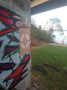 Allah korusun: Paint on paper (Work in collaboration with Stavanger school children. Allah korusun [God forbid] was translated into the children’s native languages and painted as lifesaver rings by them, cut out and wheat pasted all over the island.)
