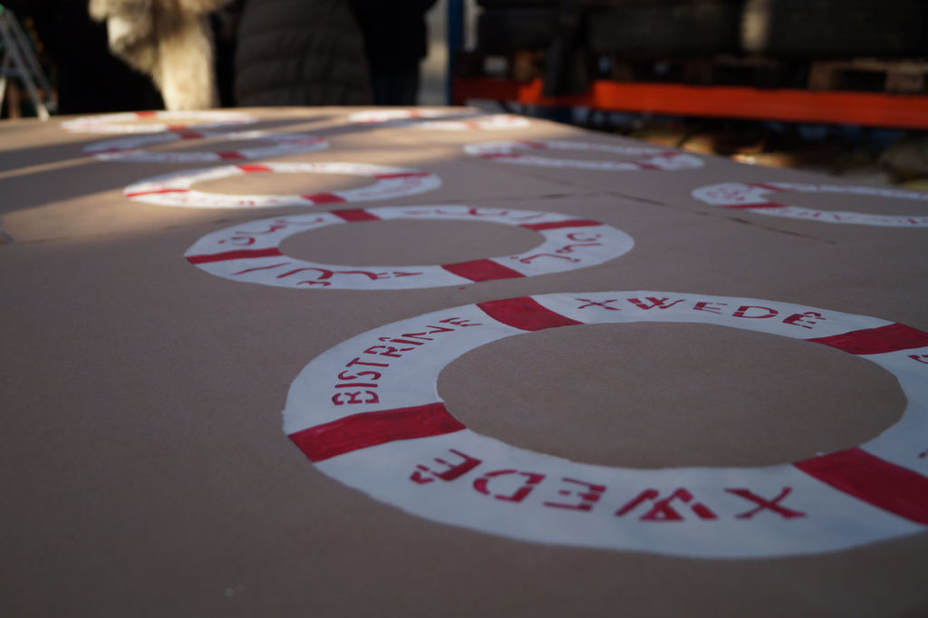“The Project is composed of multiple components: We, as an artist couple, are bringing a piece to Stavanger that has travelled the world and has been exhibited in multiple settings. The work is called Allah korusun / Gott behüte (paint on life preserver ring, 65 x 65 cm). The object is a life preserver ring with the words “Allah korusun“ (God Forbid). Songul Boyraz, a native Kurd in Turkey, and Peter Hoell, an Austrian native, have had many interactions with refugees, in Istanbul as well as in Vienna. As refugees or immigrants are often trapped in their environment without much exchange with citizens of their new countries, Boyraz and Hoell are bringing together the refugees and norwegian school kids (between 12-18 years old) to discuss the project and in a workshop paint the posters in 4 languages (norwagian, kurdish, arabic and english). Posters will be wheat pasted on various spots.